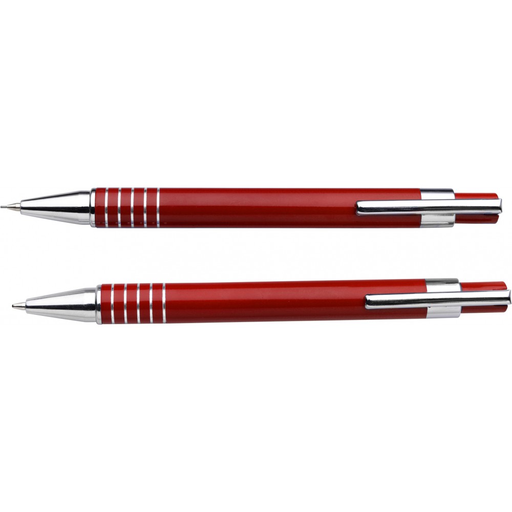 Lakkozott felületű golyóstoll fekete tollbetéttel és töltőceruza, színben hozzáillő dobozban. Emblémázás: Gravírozás, Tamponnyomás